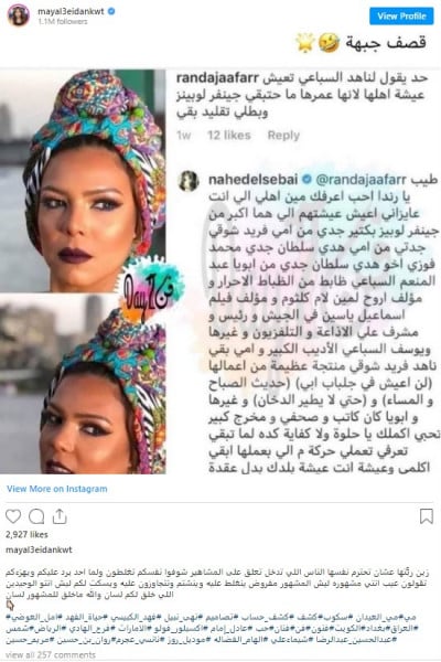 وفي التعليق على إحدى صورها كتبت متابعة لناهد: "والنبي قولوا لناهد السباعي تعيش عيشة أهلها وتبطل تقليد، عمرها ما حتبقى جينيفر لوبيز"، ما جعلها تردّ بكلمات حاسمة، وكتبت قائلة: "طيب يا رندا أحب أعرفك مين أهلي، اللي انت عايزاني أعيش عيشتهم اللي هم أكبر من جينيفر لوبيز بكتير، جدي من أمي فريد شوقي، جدتي من أمي هدى سلطان، وجدي محمد فوزي أخو خدى سلطان"، وفق (لها).