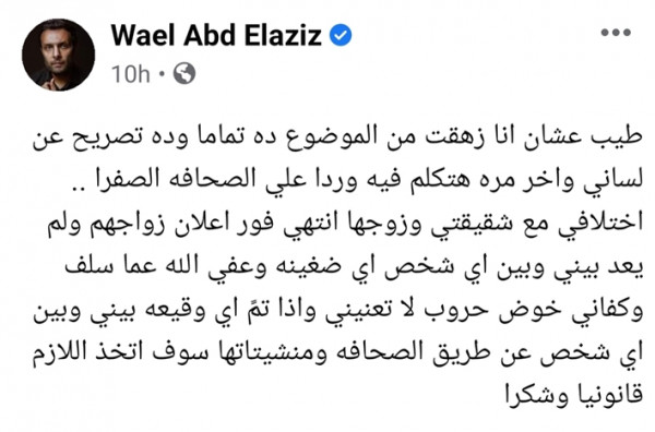 و كتب وائل عبد العزيز عبر حسابه الشخصي على تطبيق التواصل الاجتماعي (فيس بوك): "اختلافي مع شقيقتي وزوجها انتهي فور اعلان زواجهم ولم يعد بيني وبين أي شخص اي ضغينه وعفي الله عما سلف"، وفق (في الفن).