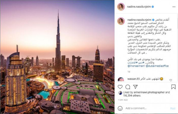 و نشرت نادين عبر حسابها الرسمي على تطبيق تبادل الصور (انستغرام) صورة لإمارة دبي وعلّقت عليها: " أتقدم بخالص الشكر لصاحب السمو الشيخ محمد بن راشد آل مكتوم، على منحي الإقامة الذهبية في دولة الإمارات العربية المتحدة، وكل الشكر والتقدير لهيئة الثقافة والفنون في دبي على دعمها الفنانين والمبدعين"، وفق (لها).