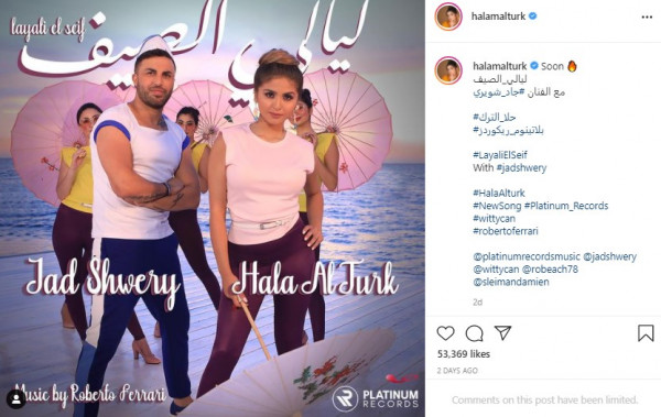 نشرت الفنانة البحرينية حلا الترك صورة تكشف بها عن تقديم الأغنية الجديدة مع المخرج اللبناني جاد شويري، من خلال ملصق دعائي جمعها بالأخير حيث ظهرا والبحر خلفهما.