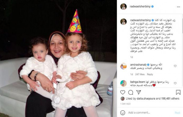 شاركت الإعلامية رضوى الشربيني جمهورها بصورة ظهرت فيها مع والدتها وشقيقتها في سنّ الطفولة لتعلن من خلالها عن ذكرى عيد ميلاد والدتها الراحلة، عبر حسابها الخاص على تطبيق تبادل الصور (انستغرام).