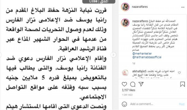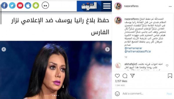 وكان نزار الفارس قد تقدّم بدعوى ضد رانيا يوسف وطالب فيها بالتعويض بمبلغ قدره 5 ملايين جنيه بسبب سبّه وقذفه على مواقع التواصل الاجتماعي، وطالب بـ5 ملايين جنيه، تعويضا له عمّا بدر من الفنانة وكلمات التشهير التي وجهتها إليه.