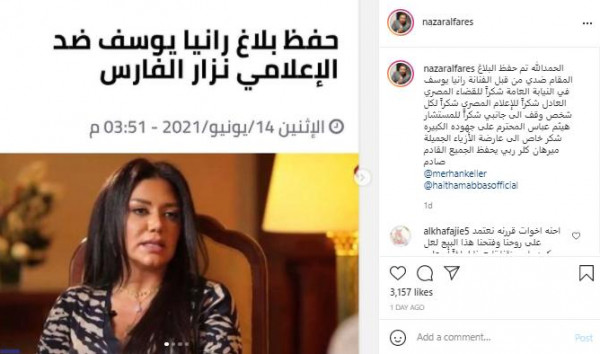 وعلّق الإعلامي العراقي على الخبر عبر حسابه الخاص عبر تطبيق تبادل الصور (انستغرام) قائلاً: "الحمد لله تم حفظ البلاغ المقدَّم ضدي من الفنانة رانيا يوسف في النيابة العامة، شكراً للقضاء المصري العادل شكراً للإعلام المصري شكراً لكل شخص وقف الى جانبي شكراً المستشار هيثم عباس المحترم على جهوده الكبيرة، و شكر خاص الى عارضة الأزياء الجميلة ميرهان كلر، ربي يحفظ الجميع القادم صادم"، وفق (لها).