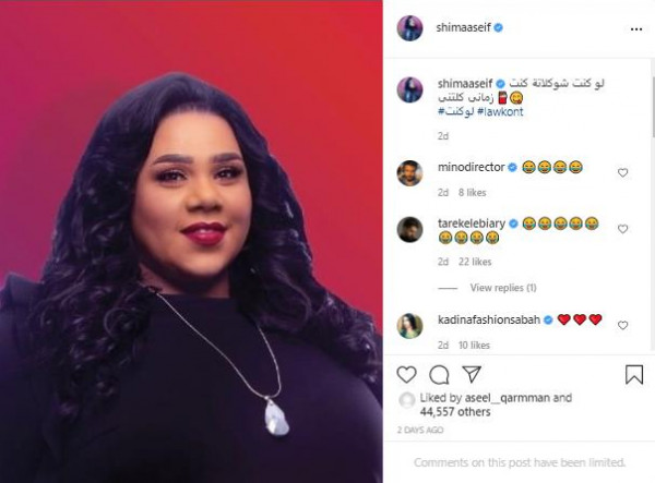 نشرت الفنانة المصرية الكوميدية شيماء سيف "هاشتاغ" "لو كنت"، على حسابها الخاص في تطبيق تبادل الصور (انستغرام)، صورة جديدة سخرت بها من نفسها بطريقة ضاحكة، وعلّقت عليها قائله: "لو كنت شوكلاتة كنت زماني كلتني".