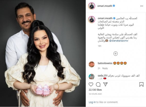 وبعد إعلان الخبر من قبل معاذ انهالت المباركات من قبل متابعيه ومن أصدقائه وأصدقاء زوجته، ولكن بالمقابل لم تعلق ديانا على الأمر عبر حساباتها على السوشال ميديا لغاية الآن، كما أنها لم تكشف وزوجها عن الاسم الذي اختاروه لمولودتهما.
