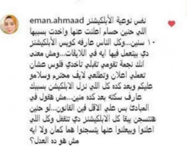 لتبدأ حملة هجوم عليها بسبب دعوتها لبرنامج التيك توك الذي بسببه تم حبس حنين حسام الشهيرة بـ"فتاة التيك توك"، وعلقت إحدى المعجبات قائلة: "أمال مش دا بردو إعلان لنفس البرامج الي حنين حسام اتحبست عشانها"، وعلقت أخرى بقولها: "نفس نوعية الأبلكيشنز اللي حنين حسام أعلنت عنها واخدت بسببها ١٠ سنين... وكل الناس عارفة كويس الأبلكيشنز دي بيتعمل فيها إيه في اللايڤات... ومش معنى إنك نجمة تقومي تقبلي تاخدي فلوس عشان تعملي إعلان وتطلعي لايف محترم وسلامو عليكم وبعد كده كل اللي نزل الأبلكيشن بسببك عارف سكته بعد كده منين... مش هقول في المبادئ بس علي الأقل فين القانون... لو حنين هتتسجن يبقا كل الابلكيشنز دي تتقفل وكل اللي اعلنوا وبيعلنوا عنها يتسجنوا هما كمان ولا إيه مش هو ده العدل؟، وفق (لها).