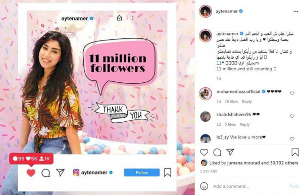 تعرضت الفنانة المصرية آيتن عامر للعديد من الانتقادات الجارحة من الجمهور والمتابعين، و ذلك بعد أن نشرت عبر صفحتها الشخصية على تطبيق تبادل الصور (انستغرام)، مقطع فيديو جديد لها تحتفل بوصول صفحتها إلى 11 مليون متابع.
