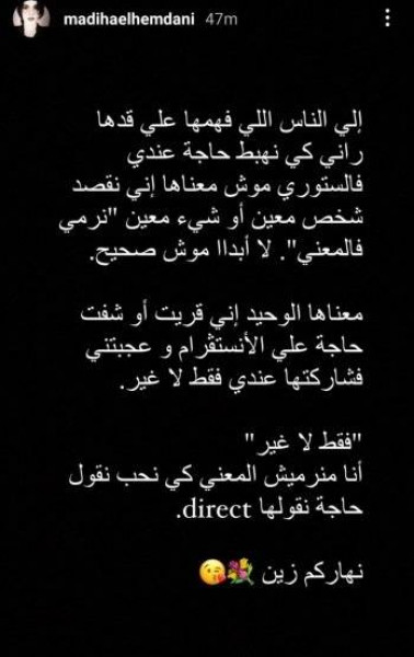وسرعان ما ربط متابعو الحمداني الصورة بطليقها ما دفعها الى التوضيح بقولها: "إلى الناس اللي فهمها على قدها، راني كي نهبط حاجة عندي فالستوري مش معناها إني نقصد شخصاً معيناً أو شيئاً معيناً (نرمي فالمعني).. لا أبداً مش صحيح".