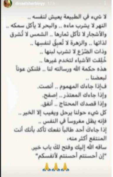و نشرت الفنانة المصرية منشوراً أثارت من خلاله ضجة كبيرة وجاء في الرسالة التي شاركتها عبر خاصية الستوريز التالي: "لا شيء في الطبيعة يعيش لنفسه.. النهر لا يشرب ماءه والبحر لا يأكل سمكه.. والأشجار لا تأكل ثمارها والشمس لا تشرق لذاتها والزهرة لا تعبق لنفسها وذات الضرع لا تشرب لبنها.. خلقت الأشياء لتخدم غيرها"، وفق (لها).