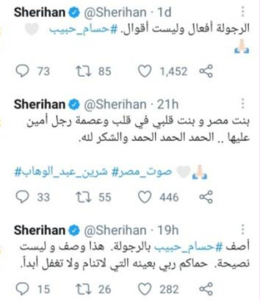 هاجم الجمهور الفنانة شريهان، و ذلك بعدما نشرت تغريدة على حسابها الخاص عبر تطبيق (تويتر)، عن الفنان حسام حبيب حيث قالت: "الرجولة أفعال وليست أقوال"، ليتفاعل الجمهور معها ظنًا منهم أنها توجه نصيحة لحسام حبيب بأن يتصرف بأفعال ولا يكتفي بالكلام فحسب.