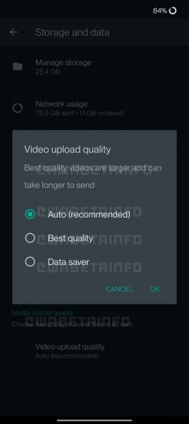 وفي التحديث المستقبلي، سيتمكن مستخدمي (واتساب) من اختيار جودة تحميل الفيديو عن طريق 3 خيارات، الاولى هي "Auto" (تلقائي)، الموصى بها من جانب التطبيق، وتقدم أفضل جودة وتوفر استهلاك لباقة الإنترنت.