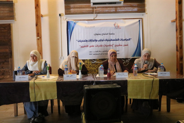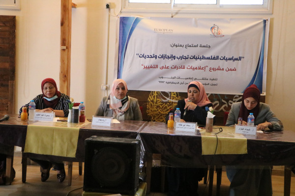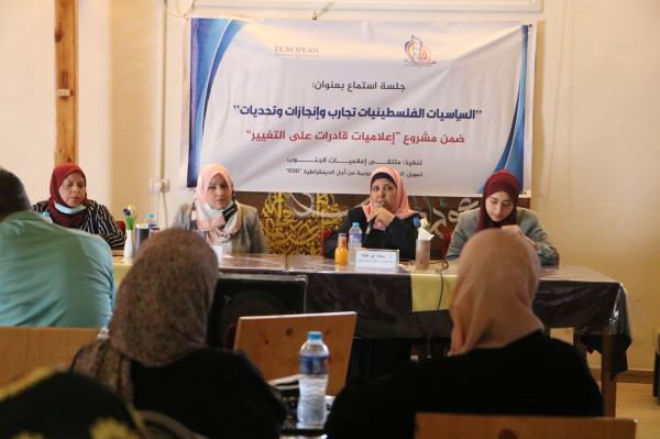 نفذ ملتقى إعلاميات الجنوب ثلاث جلسات استماع لنساء سياسيات ونقابيات بعنوان: "السياسيات الفلسطينيات تجارب وإنجازات وتحديات" تطرقن خلالها لواقع مشاركة المرأة السياسية وما حققنه من إنجازات، والاخفاقات والتحديات التي تواجه المرأة وأسباب ضعف مشاركة المرأة في صنع القرار وكيفية دمج الأجبال الجديدة في العمل السياسي والنقابي، بحضور شخصيات اعتبارية واعلامية وشخصيات من القوى الوطنية والاسلامية ودائرة اللاجئين، يأتي ذلك ضمن "مشروع إعلاميات قادرات على التغيير الممول من المؤسسة الاوربية لأجل الديمقراطية EED".