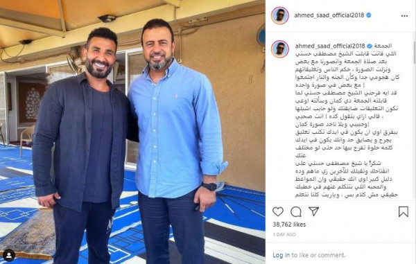 وعلق سعد: "الجمعة اللي فاتت قابلت الشيخ مصطفى حسني بعد صلاة الجمعة، واتصورنا مع بعض ونزلت الصورة، حكم الناس وتعليقاتهم كان هجوميًا جدًا، وكأن الجنة والنار اجتمعوا مع بعض في صورة واحدة"، وفق (لها).