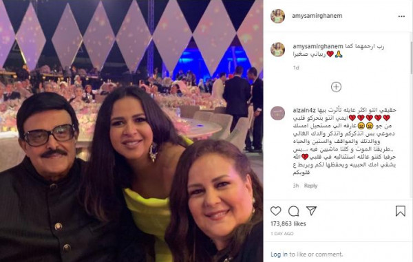 و أثارت ايمي قلق متابعيها من خلال الصورة وتعليقها الذي كتبت فيه: "رب ارحمهما كما ربياني صغيرا"، لتعلن من خلالها أن حالة والدتها الصحية لم تتحسن ولا تزال تحتاج للعناية والدعاء، وفق (لها).