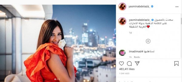 و نشرت ياسمين عدة صور لها عبر حسابها على تطبيق تبادل الصور (إنستغرام)، و علقت كاتبة: "سعدت بالحصول علي الإقامة الذهبية بدولة الإمارات العربية الشقيقة"، وفق (سيدتي).