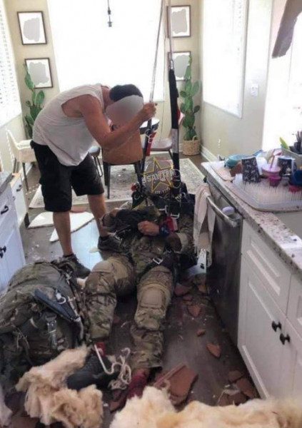 ورأى العديد من الجيران المظلي وهو في الهواء، كما أظهرت الصور حفرة في سقف المنزل المكسو بالقرميد وجنديا في المطبخ محاطًا بالحطام.