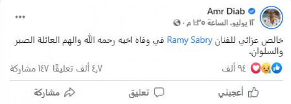 قام الفنان المصري عمرو دياب بمواساة الفنان رامي صبري، بعد وفاة شقيقه كريم، حيث كتب عبر صفحته الرسمية في موقع (فيس بوك): "خالص عزائي للفنان رامي صبري في وفاة أخيه رحمه الله وألهم الله العائلة الصبر والسلوان".