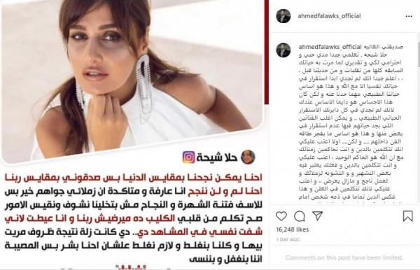 و قال فلوكس" الله الحاكم الوحيد"، حيث أضاف على صفحته الرمسية عبر تطبيق تبادل الصور" صديقتي الغالية حلا شيحة، تعلمين جيداً مدى حبي واحترامي لكي وتقديري لما مرت به حياتك السابقة كلها من تقلبات ومن حديثنا قبل، أعلم جيداً أنك لم تجدي أبداً استقراراً في حياتك نفسياً إلا مع الله وهذا هو أساس حياتنا الطبيعي مهما حدنا عنه ولكن كان هذا الإحساس هو دايماً الأساس عندك لأنك لم تجدي في كل دائرتك الاستقرار الحياتي الطبيعي"، وفق (لها).