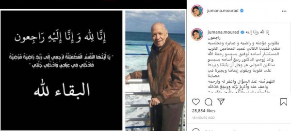 أعلنت الفنانة السورية جومانا مراد عن وفاة والد زوجها المستشار أسامة توفيق بسيسو.