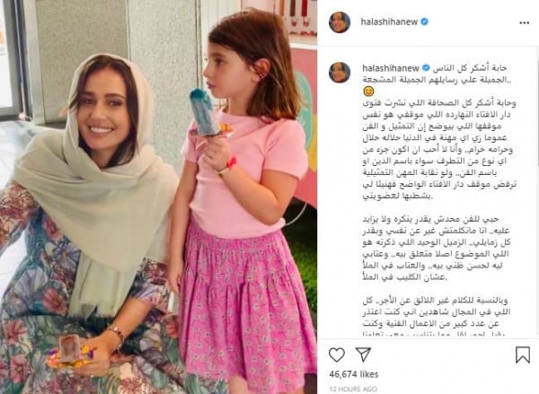 وكتبت حلا عبر حسابها الشخصي على تطبيق تبادل الصور (إنستغرام)، معلقة على قرار النقابة، قائلة: "حابة أشكر كل الناس الجميلة علي رسايلهم الجميلة المشجعة، وحابة أشكر كل الصحافة اللي نشرت فتوى دار الإفتاء النهاردة، اللي موقفي هو نفس موقفها اللي بيوضح إن التمثيل والفن عمومًا زي أي مهنة في الدنيا حلاله حلال وحرامه حرام.. وأنا لا أحب أن أكون جزءًا من أي نوع من التطرف سواء باسم الدين أو باسم الفن.. ولو نقابة المهن التمثيلية ترفض موقف دار الإفتاء الواضح فهنيئًا لي بشطبها لعضويتي"، وفق (لها).