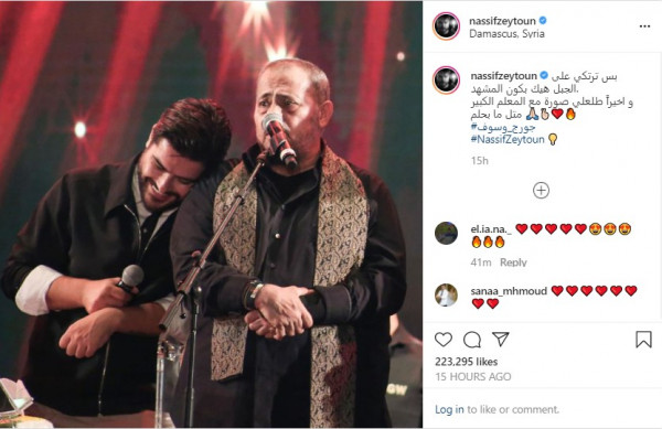 وأعاد الفنان السوري نشر الصورة وعبر عن سعادته بتحقيقه حلمه بالحصول على صورة مع "سلطان الطرب"، وعلق عليها قائلاً: "بس ترتكي على الجبل هيك بكون المشهد، واخيراً طلعلي صورة مع المعلم الكبير متل ما بحلم"، وفق (لها).