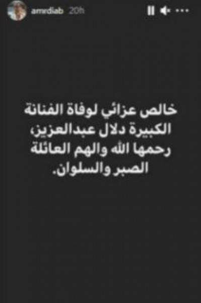 وعاود عمرو دياب، كتابة منشور جديد، ينعي فيه الفنانة دلال عبد العزيز، حيث كتب: "خالص عزائي لوفاة الفنانة الكبيرة دلال عبد العزيز، رحمها الله وألهم العائلة الصبر والسلوان"، وفق (لها).