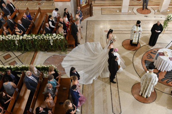 العروس تألقت بفستان ساحر من تصميم المصمم المبدع بسام نعمة، وتلا الإكليل حفل عشاء مميز.
