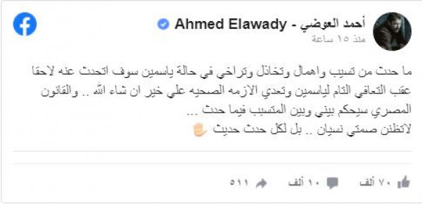 وقال في حسابه الرسمي على موقع (فيس بوك): "ما حدث من تسيّب وإهمال وتخاذل وتراخٍ في حالة ياسمين سوف أتحدث عنها لاحقا عقب التعافي التام لياسمين.. وتعدي الأزمة الصحية على خير إن شاء الله.. والقانون المصري سيحكم بيني وبين المتسبب فيما حدث.. لا تظنن صمتي نسيان.. بل لكل حدث حديث"، وفق (لها).