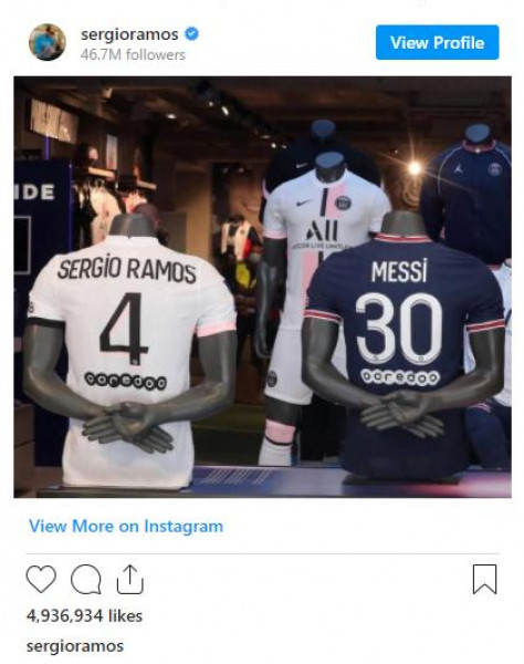 ونشر القائد السابق لريال مدريد صورة لقميصه إلى جانب القميص الجديد لميسي في واجهة متجر النادي الفرنسي، مصحوبة بالتعليق التالي "من كان ليصدق، ليو ميسي؟ أهلاً وسهلاً!".