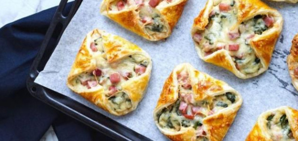 ضعي الباف باستري في صينية عليها ورق زبدة ثم ادهني الوجه بالبيض وضعي الصينية في الفرن لمدة 30 دقيقة حتى يصبح لونها ذهبياً.