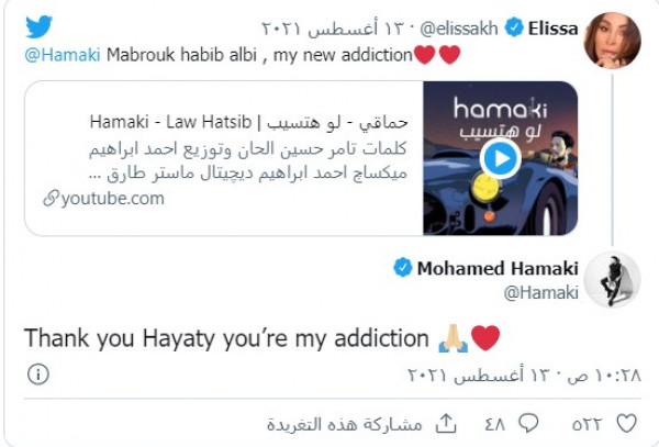 بدوره لم يتأخر محمد حماقي في الرد على إليسا حيث غرّد: " شكرا حياتي.. أنت ادماني ".