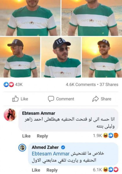 و كتبت المتابعة تعليقا على إحدى صوره: "أنا حاسة إني لو فتحت الحنفية هيطلع لي أحمد زاهر وليلى بنته"، فما كان من زاهر إلا أن انفعل ورد قائلاً: "خلاص ما تفتحيش الحنفية ويا ريت تلغي متابعتي الأول"، وفق (لها).