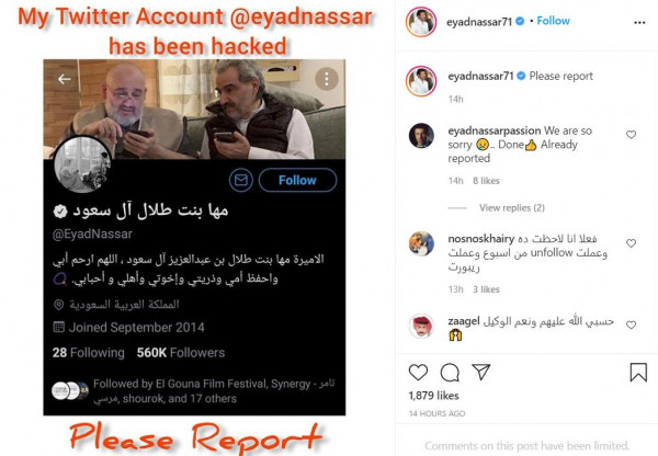 كشف الفنان إياد نصار من خلال منشور له عبر حسابه الرسمي عبر تطبيق تبادل الصور (إنستغرام)، عن اختراق حسابه الرسمي (تويتر).