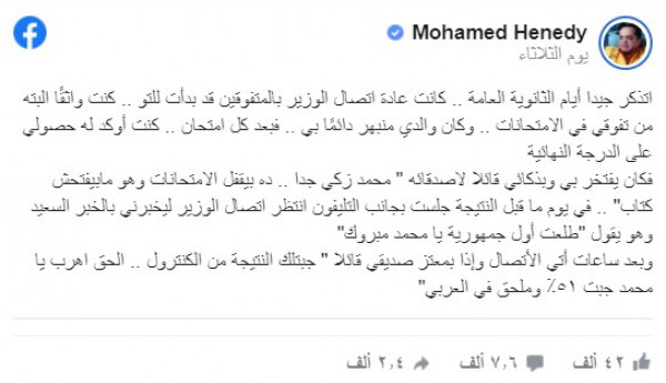 وكتب هنيدي على حسابه الرسمي في (فيس بوك): "أتذكر جيدا أيام الثانوية العامة.. كانت عادة اتصال الوزير بالمتفوقين قد بدأت للتو.. كنت واثقًا البته من تفوقي في الامتحانات.. وكان والدي منبهر دائمًا بي.. فبعد كل امتحان.. كنت أوكد له حصولي على الدرجة النهائية"، وفق (سبوتنيك بالعربي).