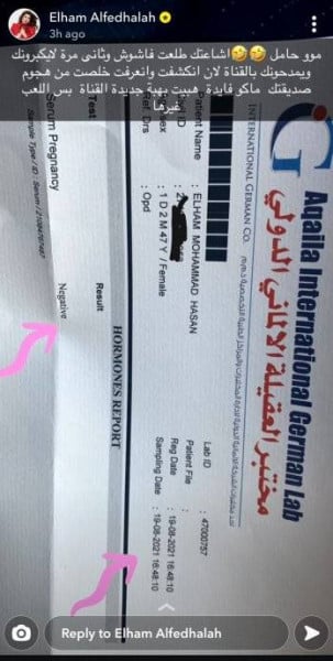 ونشرت الفضالة في حساباتها على شبكات التواصل الاجتماعي صورة تحليل للحمل، معلقةً بقولها: "مو حامل، إشاعتكِ طلعت فاشوش وثاني مرة لا يكبرونكِ ويمدحونكِ بالقناة، لأن انكشفت وانعرفت وخلصت من هجوم صديقتكِ ماكو فايدة هبيت بهبة جديدة القناة بس اللعب غيرها"، وفق (لها).