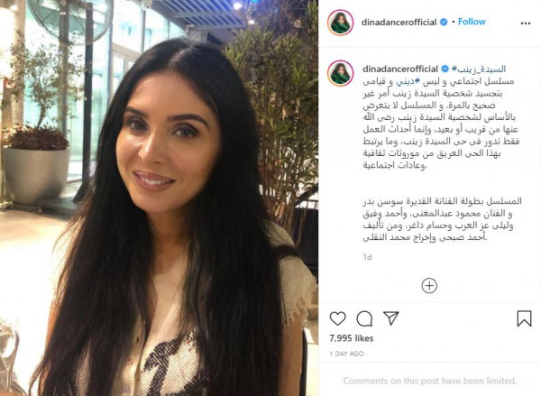وقالت دينا عبر حسابها الرسمي على تطبيق تبادل الصور (انستغرام): "إن السيدة زينب مسلسل اجتماعي وليس دينيا"، وهو لا يمت بصلة إلى شخصية "السيدة زينب"، حفيدة الرسول، وفق (لها).