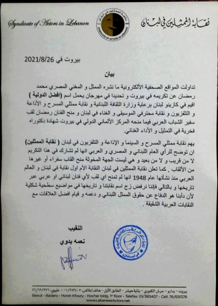 وجاء في بيان إعلامي أصدرته النقابة: "تداولت المواقع الصحافية الإلكترونية ما نشره الممثل والمغني المصري محمد رمضان عن تكريمه في بيروت، وتحديداً في مهرجان يحمل اسم "أفضل الدولية"، أُقيم في كازينو لبنان برعاية وزارة الثقافة اللبنانية ونقابة ممثلي المسرح والإذاعة والتلفزيون ونقابة محترفي الموسيقى والغناء في لبنان، ومُنِح الفنان لقب "سفير الشباب العربي"، فيما منحه المركز الألماني الدولي في بيروت شهادة دكتوراه فخريّة في التمثيل والأداء الغنائي"، وفق (لها).