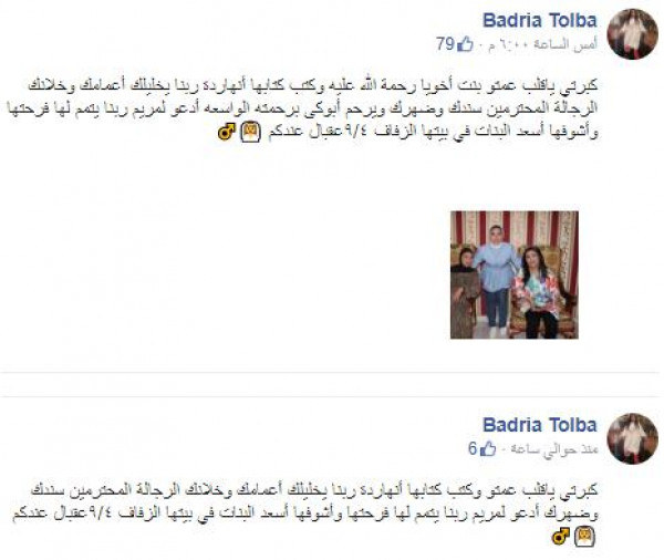 وقالت بدرية عبر حسابها الشخصي في (فيسبوك): "كبرتي يا قلب عمتو بنت أخويا رحمة الله عليه، وكتب كتابها النهار ده، ربنا يخلي لك أعمامك وخلانك الرجالة المحترمين سندك وضهرك، ويرحم أبوك برحمته الواسعة".