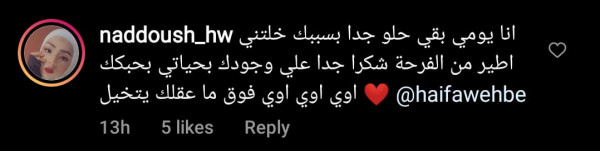 وعبرت ندوش عن حبها لهيفاء وقالت: " أنا يومي حلو جداً بسببك خلتيني أطير من الفرحة، شكراً جداً على وجودك بحياتي بحبك أوي أوي فوق عقلك ما يتخيل".