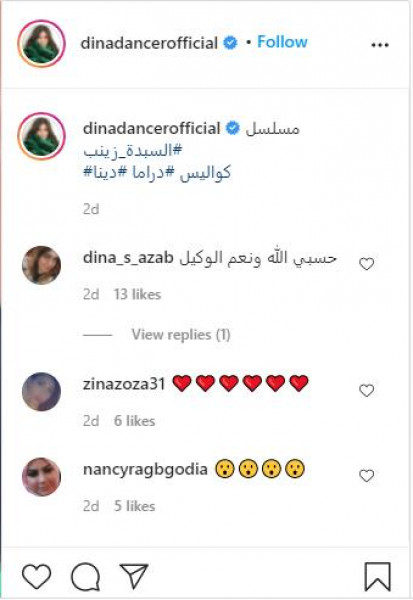 شاركت الفنانة دينا عبر حسابها في تطبيق تبادل الصور (إنستغرام) مقطع فيديو قصيراً ظهرت فيه وهي ترتدي النقاب وتخفي وجهها، ما عدا العينين، كاشفةً أن هذا المقطع مأخوذ من مسلسلها الجديد "السيدة زينب" الذي تقدّم فيه شخصية امرأة محجّبة، ثم ترتدي النقاب.