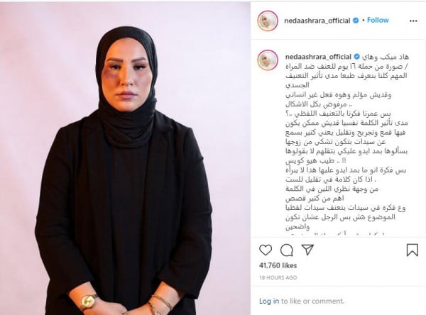 وكتبت في حسابها الرسمي (إنستغرام): "هاد ميكب وهاي صورة من حملة 16 يوم للعنف ضد المرأة"، وفق (لها).