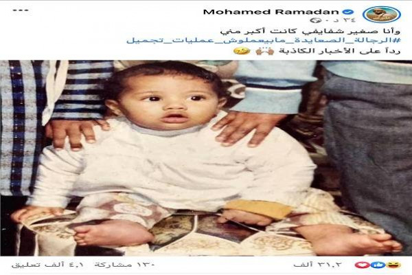 ورد رمضان، عبر حسابه الشخصي بتطبيق تبادل الصور (انستغرام)، حيث نشر صورة له وهو طفل، معلقاً عليها : "وأنا صغير شفايفي كانت أكبر مني، الرجالة الصعايدة مابيعملوش عمليات تجميل رداً على الأخبار الكاذبة"، وفق (لها).