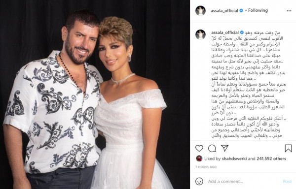 علقت المطربة السورية أصالة نصري على زواجها من الشاعر العراقي حسن الفايق، عبر صفحتها الخاصة لتطبيق تبادل الصور والفيديو (إنستجرام)، مؤكدةً خبر ارتباطهما وعلاقة الصداقة التي جمعتهما والتي تحولت إلى حب فزواج.