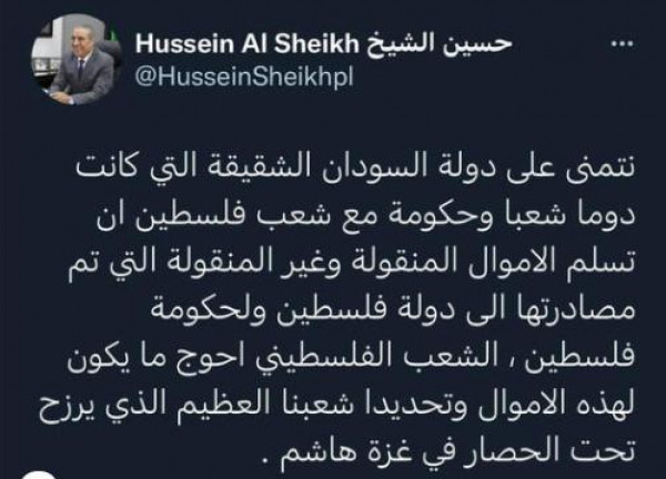 وقال الشيخ، في تغريدة عبر حسابه بموقع (تويتر): "نتمنى من السودان الشقيقة التي كانت دومًا شعبًا وحكومة مع شعب فلسطين أن تسلم الأموال المنقولة وغير المنقولة التي تم مصادرتها إلى دولة فلسطين ولحكومة فلسطين".
