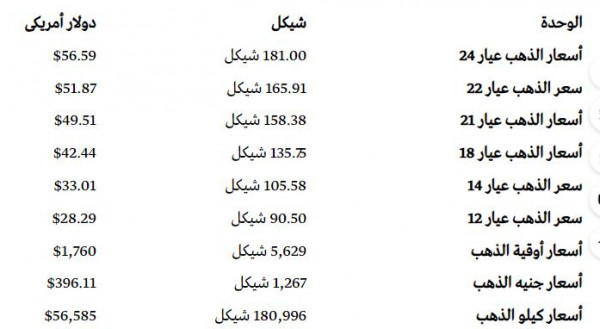 جاءت أسعار الذهب في أسواق فلسطين، اليوم الإثنين، وفقًا للشيكل الإسرائيلي والدولار الأمريكي على النحو التالي: