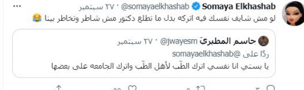 نشرت الفنانة المصرية سمية الخشاب، سؤال قد طرحه عليها أحد متابعيها عبر حسابها الشخصي في (تويتر)، وجاء فيه: أنا نفسي أترك الطب لأهل الطب، وأترك الجامعة على بعضها"، لتردّ عليه سمية بنصيحة غريبة مفادها: "لو مش شايف نفسك فيها اتركه، بدل ما تطلع دكتور مش شاطر وتخاطر بينا".