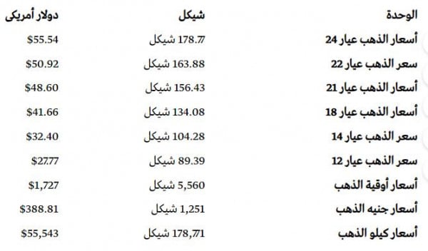 جاءت أسعار الذهب في أسواق فلسطين، اليوم الخميس، وفقًا للشيكل الإسرائيلي والدولار الأمريكي على النحو التالي: