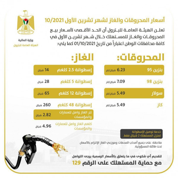 أسعار المحروقات والغاز في فلسطين لشهر أكتوبر