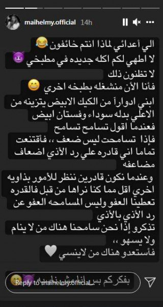 وكتبت مي على الصورة: "إلى كل أعدائي، لماذا أنتم خائفون؟ لا أطهي لكم أكلة جديدة في مطبخي، لا تظنون ذلك.. فأنا الآن منشغلة بطبخة أخرى، أبني أدواراً من الكيك الأبيض، يتزينه من الأعلى بدلة سوداء، وفستان أبيض.. فعندما أقول تسامح تسامح، فإذا تسامحت ليس ضعفاً، فاقتنعت تماماً بأنني قادرة على رد الأذى أضعافاً مضاعفة".