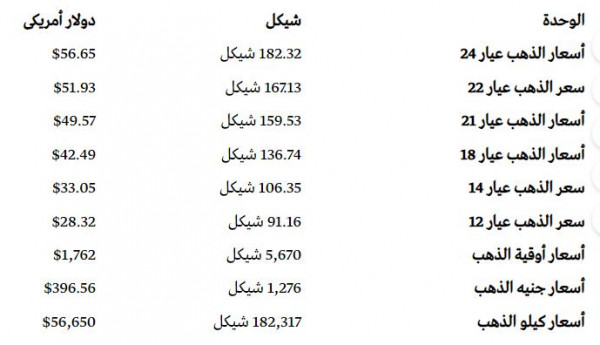 جاءت أسعار الذهب في أسواق فلسطين، اليوم الإثنين، وفقًا للشيكل الإسرائيلي والدولار الأمريكي على النحو التالي: